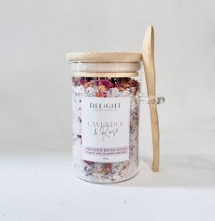 Relax, unwind and sooth sore, tired muscles with our all-natural Lavender & Rose Infused Bath Soak containing a beautifully infusion of Epsom salts, Himalayan rock salt, rose petals, pure essential oils and lavender flowers.